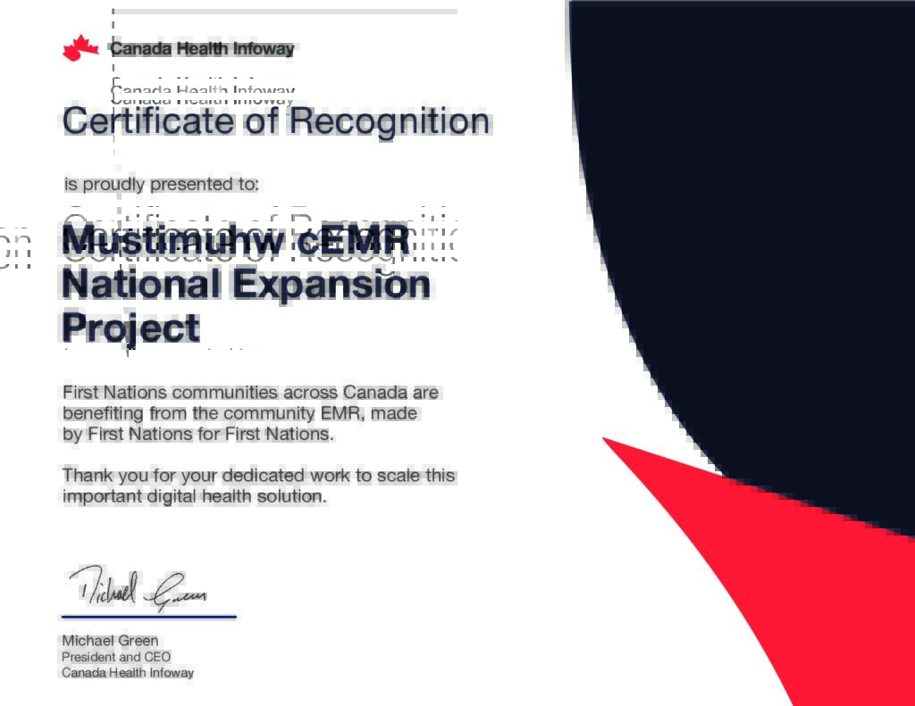 The Community Electronic Medical Record (cEMR), version 12.01.05, of Mustimuhw Information Solutions Inc. has received Canada Health Infoway Pre-Implementation Certification as an Electronic Medical Record.